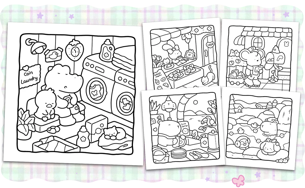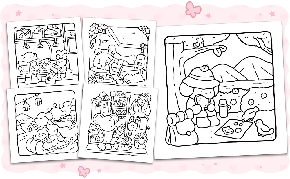 Come spend a fun day at the beach! Or have a relaxing movie night with friends! Maybe visit a charming bakery! All of these wonderful day trips and more are waiting for you in this new collection of soothing coloring pages from Coco Wyo.