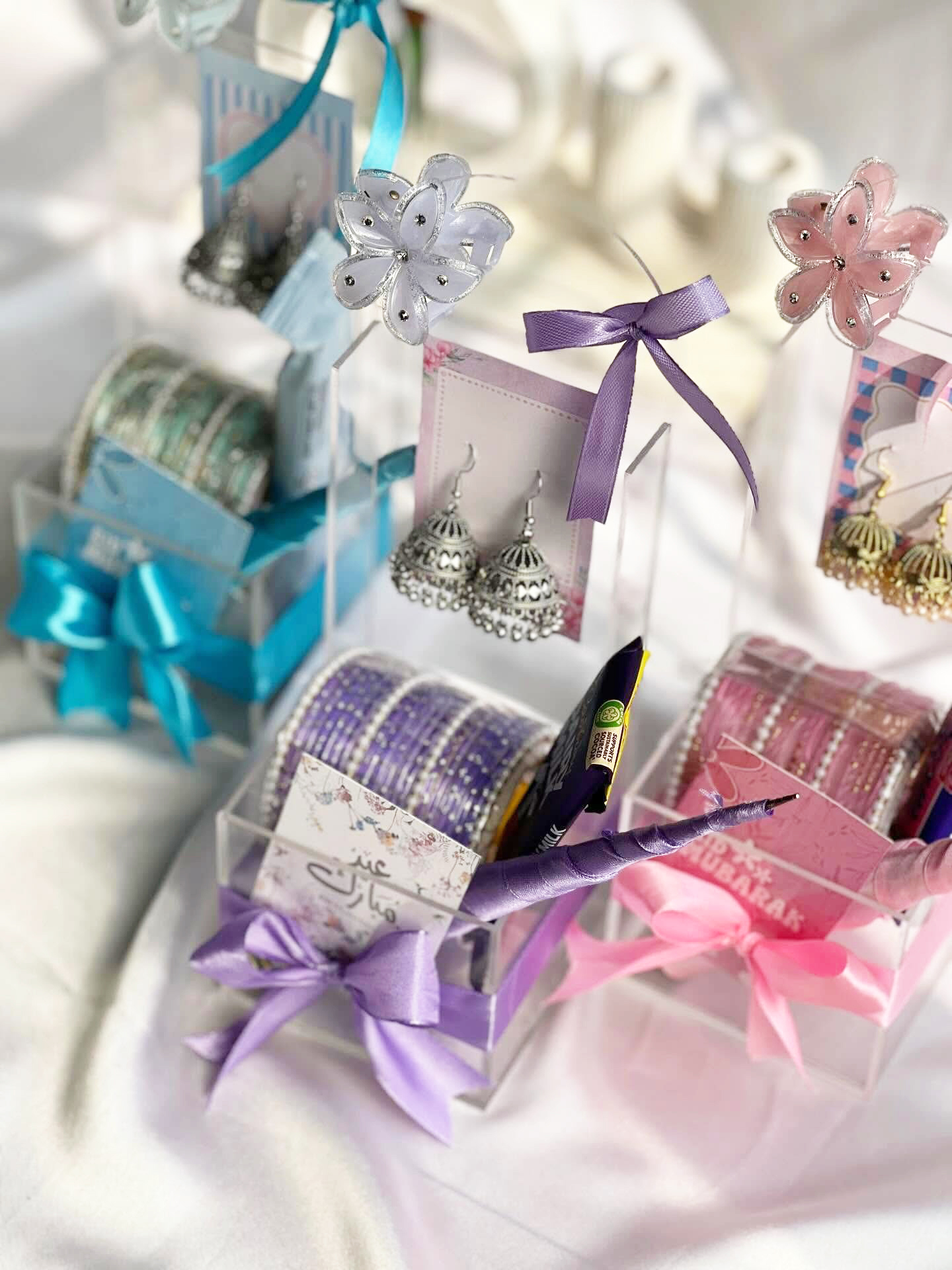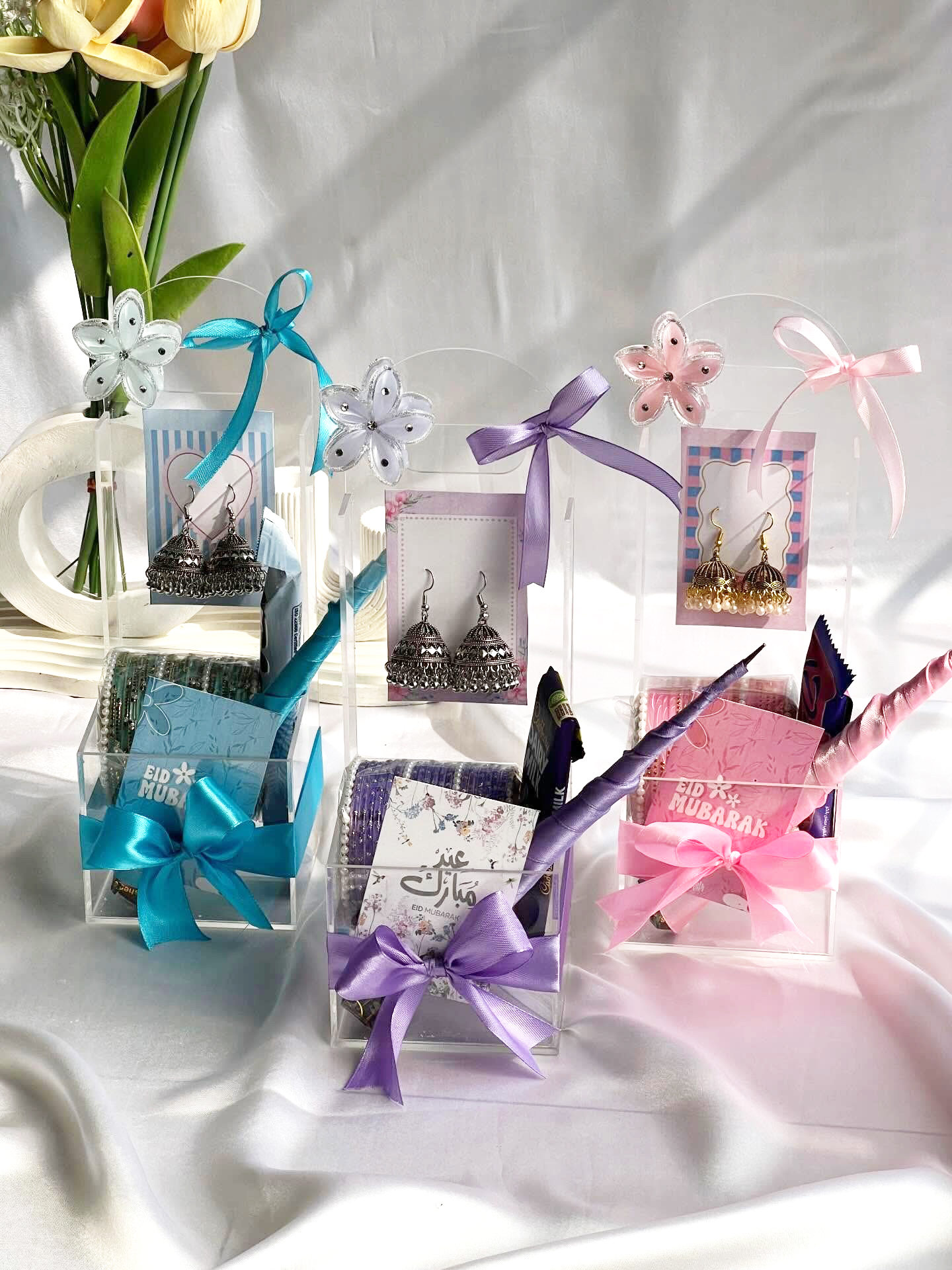 1 Bangle set 1 Pair of jhumka* 1 Flower clip 1 Eid card 1 Chocolate 1 Mehedi 1 Customized Cithi* With Beautiful Transparent Acrylic Box